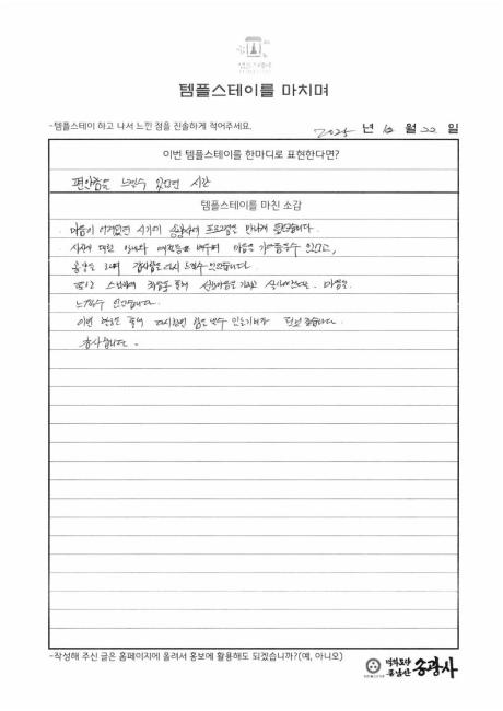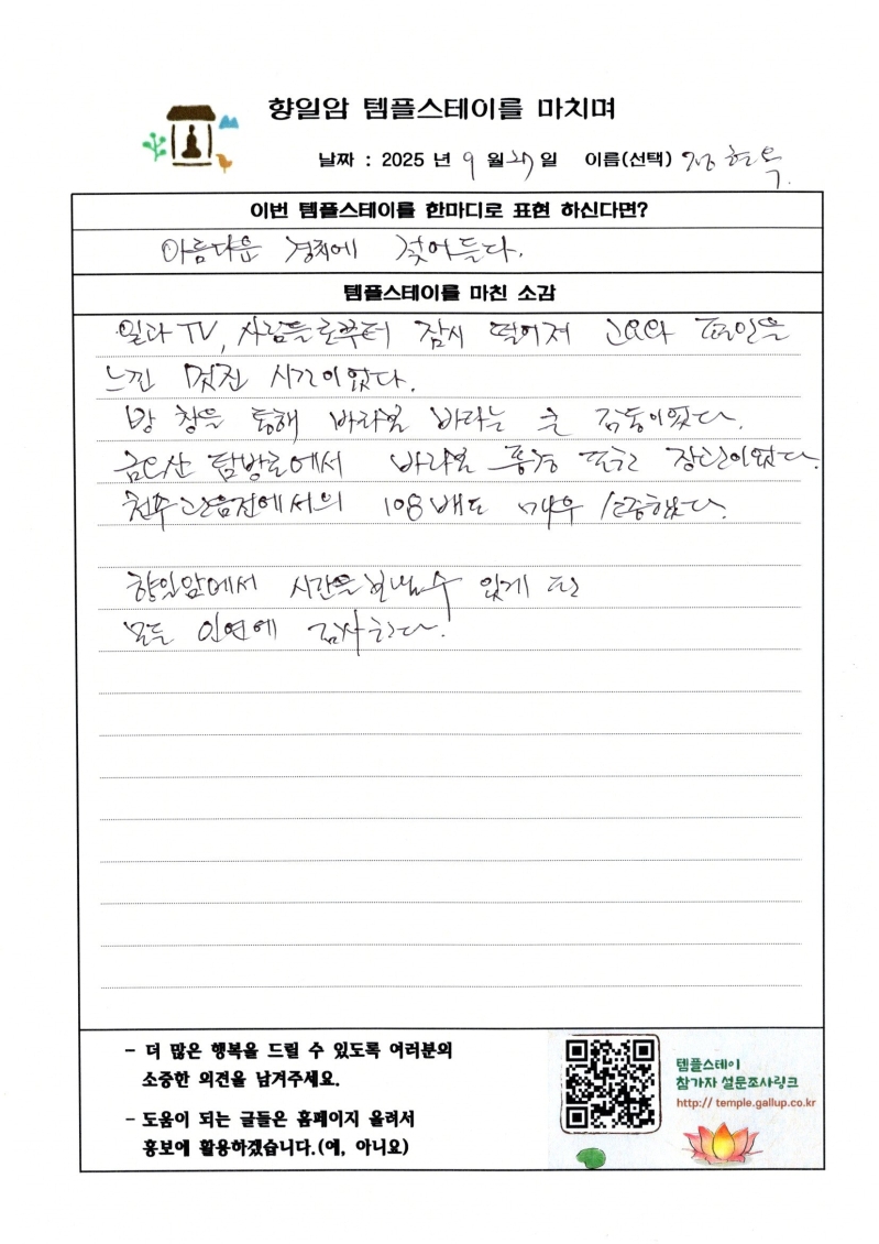 조용하고 고즈넉한 곳에서 마음을 다스릴 수 있어서 너무 좋았습니다.